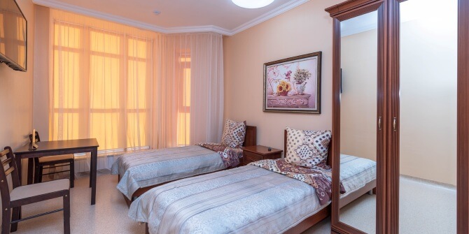 Стационар. Работают дневной и круглосуточный стационары на 30 коек. В каждой палате установлен холодильник, телевизор, душевая кабина и уборная. Пациенты питаются по меню ресторана, блюда из которого можно выбрать по своему вкусу. На каждом этаже стационарного отделения работает пост медсестер и процедурный кабинет. При необходимости клиника предоставляет VIP-палаты. В отделении анестезиологии и реанимации установлены три функциональные кровати с монитором и аппаратом для искусственной вентиляции легких.